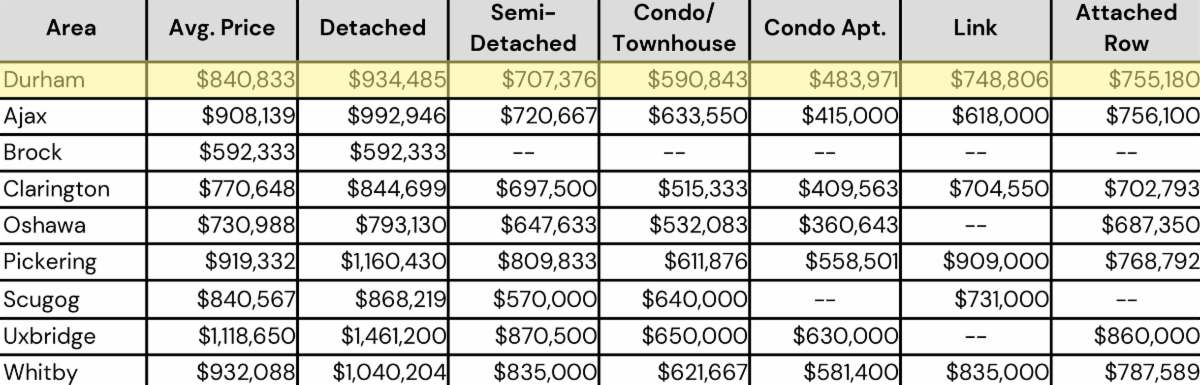November 2025- Durham Region All Home Types Sales Stats- Average Price